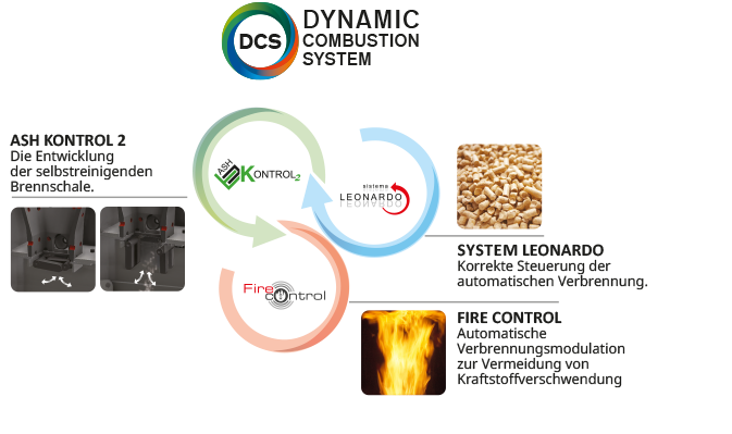 DCS ist das exklusive dynamische Verbrennungssystem, das die Wirkung von 3 Edilkamin Technologien koordiniert: AshKontrol 2, Fire Control und das Leonardo System.