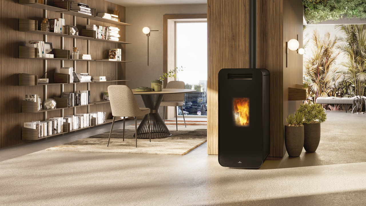 Stufa a pellet dall'estetica moderna con vetro “Magic” totalmente nero che rende visibile la fiamma ma nasconde il focolare quando è spento, per un design sempre elegante.