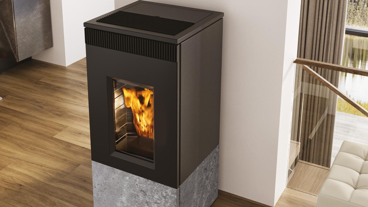 Pelletofen mit klarem, geradlinigem Design. Die halbtransparente Robax® Nightflame-Scheibe schränkt bei ausgeschaltetem Ofen die Sicht ein und verdeckt den Feuerraum teilweise.