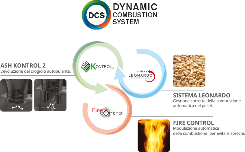 DCS è l’esclusivo sistema di combustione dinamica che coordina l’azione di 3 tecnologie Edilkamin: ashKontrol 2, Fire Control e sistema Leonardo.